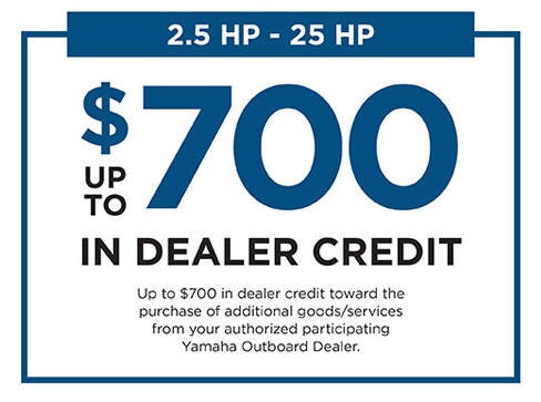 Consumer benefit for purchasing a new (unused, not previously warranty registered) select eligible Yamaha four stroke outboard is based on horsepower as follows: 425 -450 hp is a 24-month Yamaha Extended Service (“Y.E.S.”) contract (choice offered by Florida dealers is a 24-month Yamaha Extended Limited Warranty in lieu of Y.E.S. contract); 30-350 hp is a 36-month Yamaha Extended Service contract (choice offered by Florida dealers is a 36-month Yamaha Extended Limited Warranty in lieu of Y.E.S. contract); and 2.5-25 hp and 150-450 hp is a dealer credit of up to $700, based on hp, toward the MSRP value of goods and/or services purchased, at the authorized participating dealer that sold the outboard, at no extra cost to consumer. To be eligible, outboards must also have been manufactured since January 2018. Promotion is limited to available stock in dealer inventory that is sold, delivered, PDI (Pre-Delivery Inspection) completed, and warranty registered on YMBS by an authorized Yamaha outboard dealer between the dates of October 6, 2025 – December 8, 2025. Any outboard sold, delivered, PDI (Pre-Delivery Inspection) completed and/or warranty registered after these dates is not eligible. No model substitutions, benefit substitutions, extensions or rain checks will be allowed. Outboards sold or provided for commercial, camp, resort, guide, rental, promotional/demo, government agency, competition, tournament or sponsorship use are not eligible. This promotion cannot be used in conjunction with any other Yamaha offer. Some exceptions may apply. Some exclusions may apply in the Yamaha Extended Limited Warranty offered by Florida dealers (as compared to the Y.E.S. contract), such as TRIP coverage. In Florida, Yamaha Extended Service is administered by Automotive Warranty Services of Florida, Inc. 175 W. Jackson Blvd., Chicago, IL 60604 (866) 937-3983 (License #60023). Promotion is only applicable from authorized participating Yamaha Outboard dealers in the U.S.A. sold to purchasing consumers residing in the U.S.A. See authorized participating Yamaha dealer for complete details. Yamaha reserves the right to change or cancel this promotion at any time.