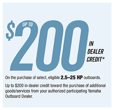 *PROGRAM TERMS AND CONDITIONS: Consumer benefit for purchasing a new (unused, not previously warranty registered) select eligible Yamaha four stroke outboard is based on horsepower as follows: 30-450 hp is a 24-month Yamaha Extended Service (“Y.E.S.”) contract (choice offered by Florida dealers is a 24-month Yamaha Extended Limited Warranty in lieu of Y.E.S. contract) 2.5 hp to 25 hp four stroke outboard is a dealer credit of up to $200, based on hp, toward the MSRP value of additional goods and/or services purchased, at the authorized participating dealer that sold the outboard, at no extra cost to consumer. To be eligible, outboards must also have been manufactured since January 2019. Promotion is only applicable from authorized participating Yamaha Outboard dealers in the U.S.A. sold to purchasing consumers residing in the U.S.A. Promotion is limited to available stock in dealer inventory that is sold January 5, 2026 – March 31, 2026, and PDI completed, delivered and warranty registered on YMBS by the dealer in accordance with Yamaha’s promotion and warranty registration requirements. No model substitutions, benefit substitutions, extensions or rain checks will be allowed. Outboards sold or provided for commercial, camp, resort, guide, rental, promotional/demo, government agency, competition, tournament or sponsorship use are not eligible. This promotion cannot be used in conjunction with any other Yamaha offer. Some exceptions may apply. Some exclusions may apply in the Yamaha Extended Limited Warranty offered by Florida dealers (as compared to the Y.E.S. contract), such as TRIP coverage. In Florida, Yamaha Extended Service is administered by Automotive Warranty Services of Florida, Inc. 175 W. Jackson Blvd, Chicago,IL 60604 (866) 937-3983. License # 60023. See authorized participating Yamaha dealer for complete details. Yamaha reserves the right to change or cancel this promotion at any time. Yamaha Motor Finance Corporation, U.S.A., dba Yamaha Financial Services, is an affiliate of Yamaha Motor Corporation, U.S.A. offering financing solutions to support Yamaha Dealers and loyal Yamaha Customers nationwide.